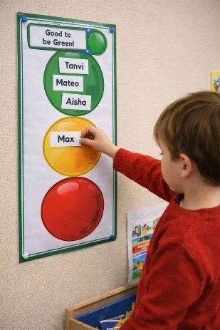 AI generated image - A child is asked to remove their name from the green circle of the class traffic light behaviour chart, and place it on the amber circle. A public display of disapproval.